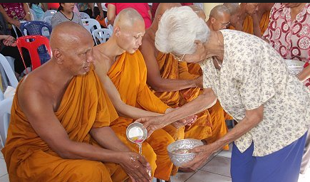 Le fait de s’asperger d’eau parfumée et consacrée et de laver à grandes eaux les bâtiments et les bouddhas.