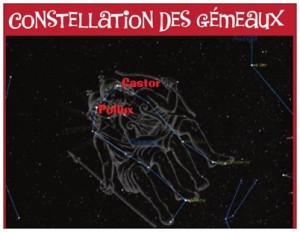 Si on s’en tient aux données astronomiques, la constellation des gémeaux comprend deux étoiles Castor et Pollux nommés d’après la légende grecque.