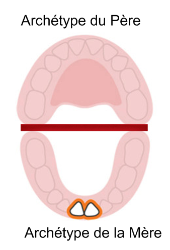 La mâchoire du haut (pour le démarrage de vie) est associée à l’archétype « Père ». C’est son devenir qui s’inscrit alors par le biais des dents. Le Père est associé à l’esprit.