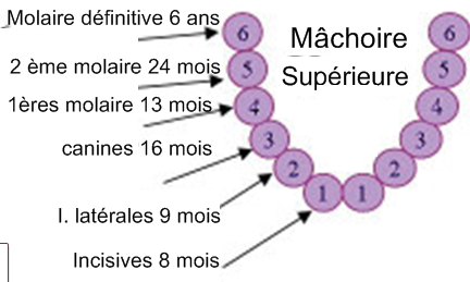 • les canines en haut 16 à 22 mois