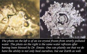 » La photo de gauche est un cristal d’eau gelée prise dans une eau très polluée. La photo de droite vient de la même eau polluée mais elle a été recongelée après avoir été bénie par le docteur Emoto ».