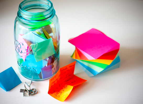 Lorsque vous éprouvez un profond sentiment de reconnaissance pour ce que vous avez vécu, expérimenté, ressenti etc…décrivez rapidement la situation sur un bout de papier et mettez ce dernier dans un bocal de la cuisine.