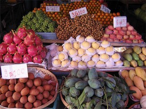 Quand nous y étions c’étaient les mangues et d’autres fruits inconnus, mélange subtil de lychee et de mandarine.