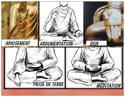 Devant la difficulté à résister aux assauts des démons juste avant son illumination, Bouddha a demandé l’aide de la nature et de la terre mère. La main droite touche le sol, paume tournée vers le ciel.